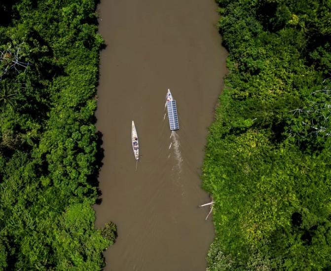 The journey between the isolated villages was made possible thanks to their boat, a traditional river canoe aside from one distinctive feature on top: 24 solar panels that harness sunlight to power an engine.