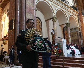 In a changing of the guard, the National Police assumed the responsibility of guarding the Niño Viajero Tuesday night from the Armed Forces. The ceremony took place at the Cathedral on Parque Calderon. (El Mercurio)