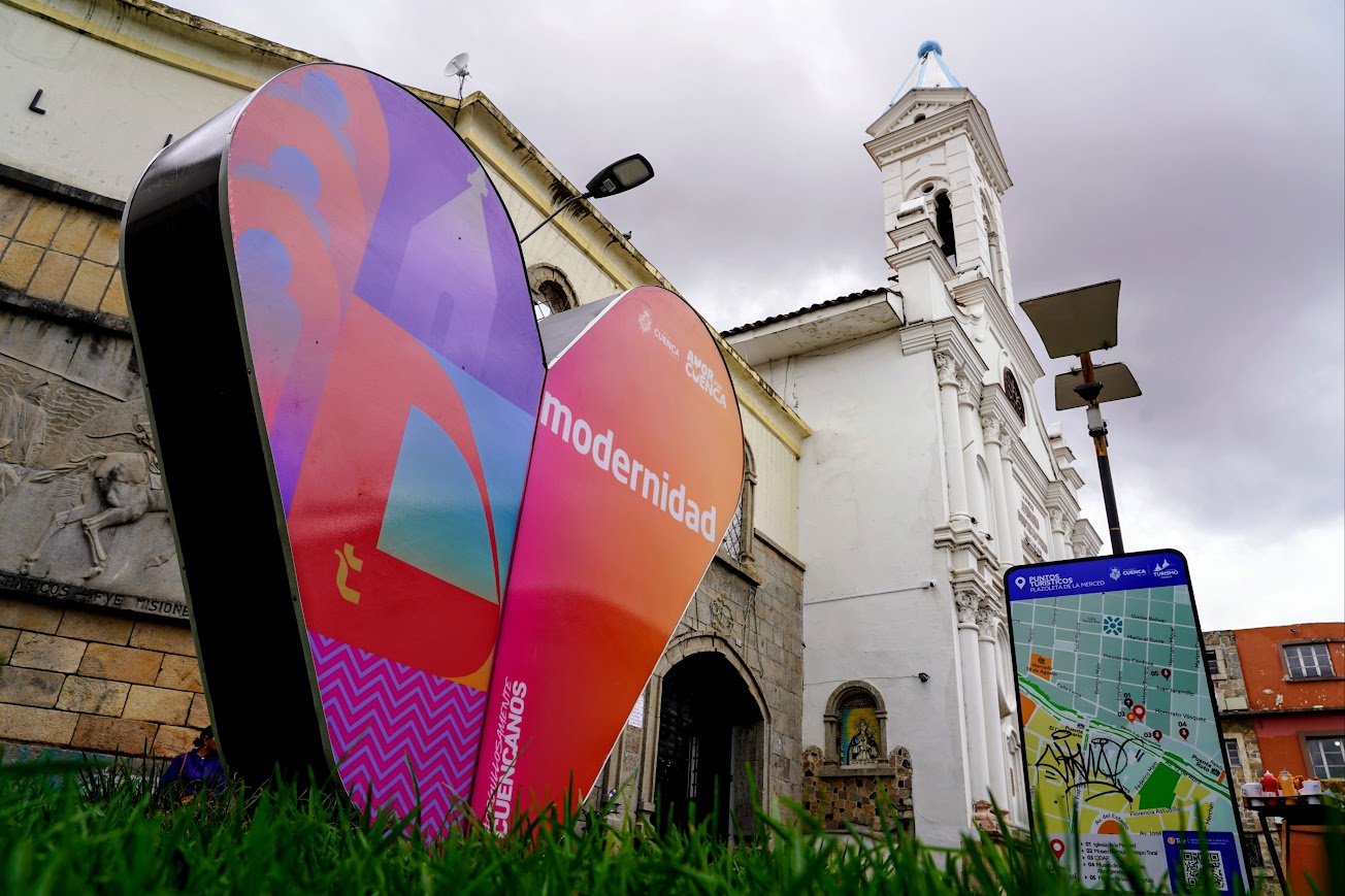 An “AmorCuenca” heart sits in the grass in front of Iglesia Católica Nuestra Señora de La Merced. The hearts can be seen throughout the city.