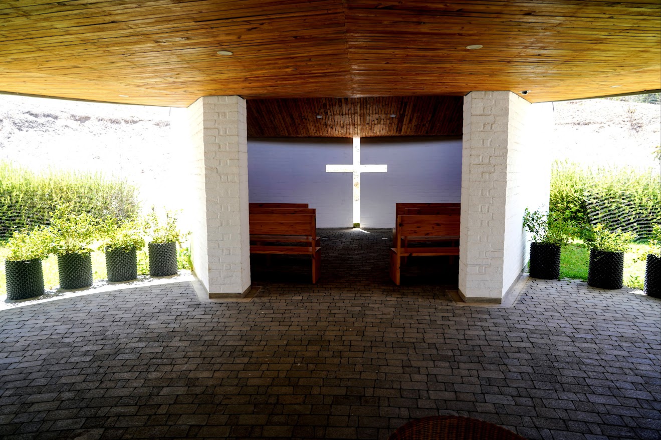 A beautiful and simple chapel is available to anyone. Light from the outside lights up the cross on the wall.