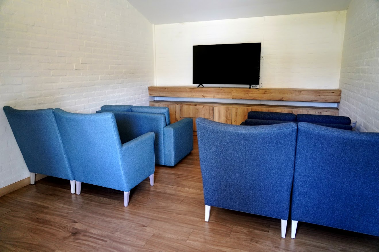 There is a physical therapy/exercise room. For anyone desiring a need for prayer and worship, a chapel is at one end. A cinema room is on one side for groups of people to watch television and movies. And if one wants to chill outside, there is a covered area with tables, chairs, and plants.