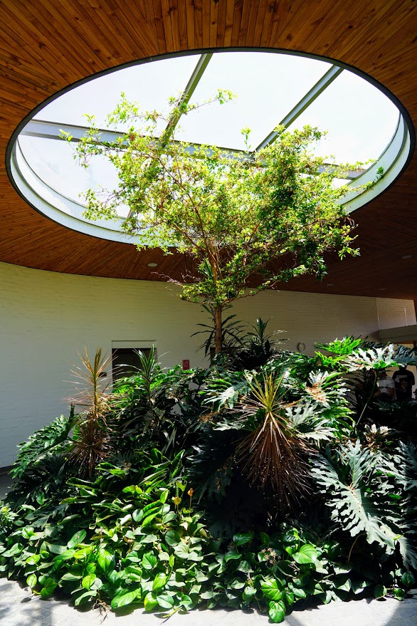 Light from a large skylight illuminates an interior garden.