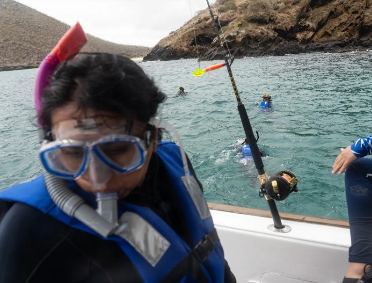 Tourists snorkeling during a charter trip off the coast of Floreana Island.