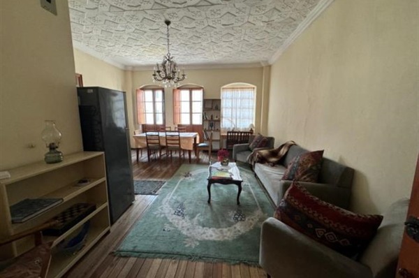 The spacious open-plan layout combines the kitchen, living, and dining areas, creating a warm and inviting ambiance, accentuated by antique furniture, high ceilings, and a striking chandelier. Natural light floods the space through large windows, enhancing the open atmosphere.