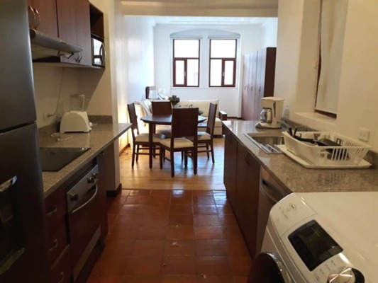 Located six blocks from Parque Calderon, this tastefully restored building has ten apartments, 6 suites and 4 bedrooms on an area of 2152sq/ft. The building has several common areas, including a kitchen and dining area to serve the one-bedroom units, a large living room with high ceilings great to enjoy the environment of a colonial house. The 6 suites for the ones that like more privacy have their own kitchen, living/dining room area. It has two outside patios and a great terrace on the only apartment on the 3rd floor. All furnishings, including televisions, linens, house wares, and appliances. Rental includes all utilities, and Fiber optic Internet. There is also a common laundry area with washer and dryer. For mature tenants only. No pets and no smoking including in outside terrace areas.