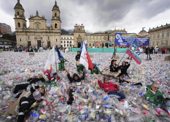 Dozens of Colombian waste pickers inundated Bogota’s iconic Bolivar Square with about 15 tons of recyclable goods Tuesday to protest decreasing income and tougher conditions for scavengers. They collect trash from homes, factories and office buildings and sell it to local recycling plants.
