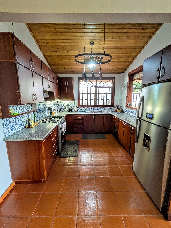 The outdoor patio includes a secure storage bodega, separate laundry area, a complete kitchen with gas stove, refrigerator, gas fire pit, wood-fired oven and plenty of seating. The 660M2 lot includes a covered garage, space for 5 vehicles, fruit trees, raised garden beds, and complete irrigation setup.