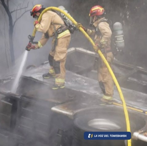Cuenca firemen extinguish flames that engulfed a Cuenca-to-Guayaquil bus following a Wednesday crash.