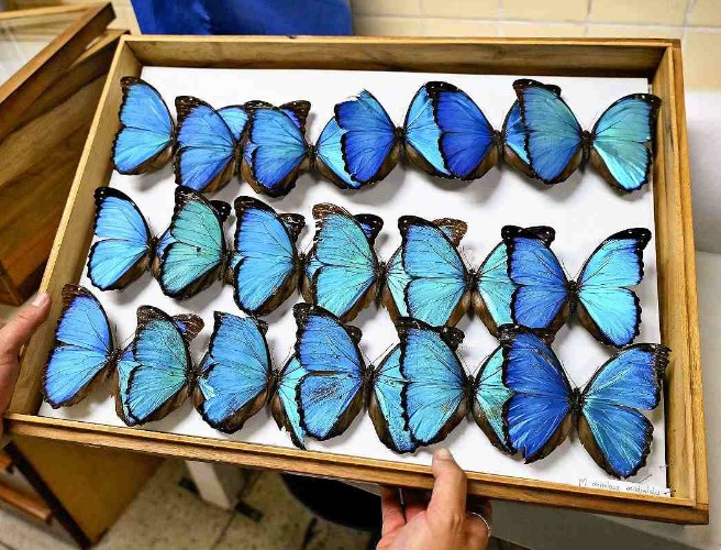 Biologist Maria Fernanda Checa carries a box with embalmed butterflies at the Pontifical Catholic University of Ecuador in Quito.