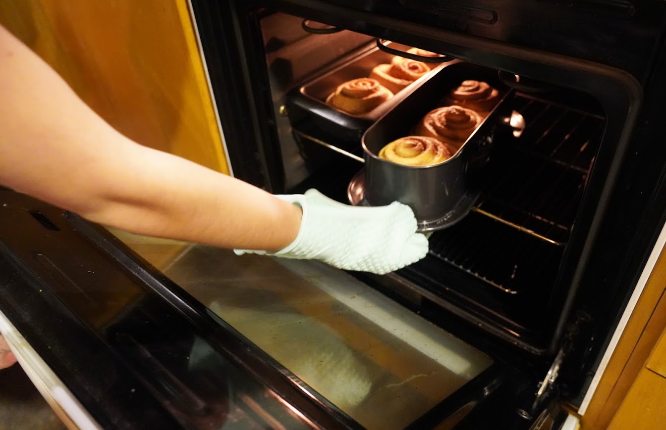 Freshly baked cinnamon rolls being taken out of the oven. They must cool before being iced.