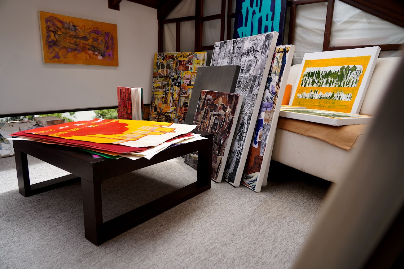 Collages, the technique and the resulting work of art in which pieces of paper, photographs, and fabric are arranged and adhered onto a supporting surface, is a big portion of what is being exhibited at Casa Aurora.