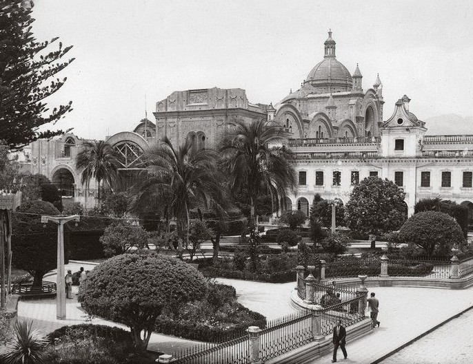 Parque Calderon in the late 1890s. Note the new cathedral under construction in the background. The fence around the park was intended to keep campesinos and the indigenous out — only citizens of European heritage were allowed in.