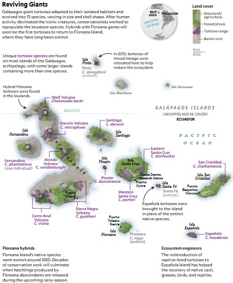 On Santa Fe Island, where native tortoises are extinct, park rangers have released a similar species that they bred in captivity and then flew to the island via helicopter.