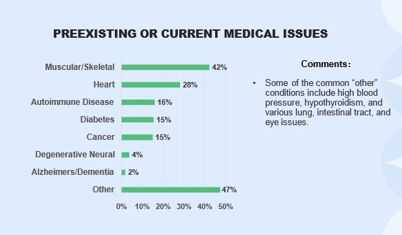 Over 57% of the respondents have lived in Cuenca more than 6 years. Fully 80% reported speaking no better than intermediate Spanish, suggesting that most expats will need English-speaking caregivers if they need long-term care. Finally, many respondents reported current or past challenges with muscular/skeletal problems and all of the typical health challenges of aging were also commonly mentioned.