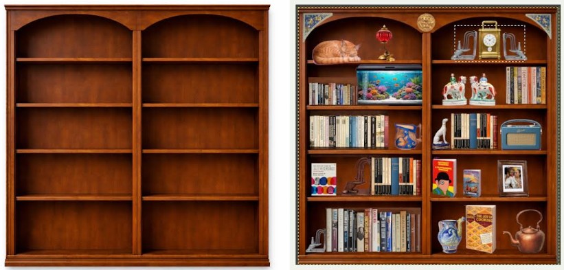 Start by finding a high-resolution image of a bookcase, either a real one from a library or an antique furniture catalog image, then use AI only if you need help to strip out musty old books, or extending the image to fit your intended print size; after that, do the real work in GIMP by treating the bookcase as the background layer and everything you add as separate layers, which you can scale, rotate, and position precisely.