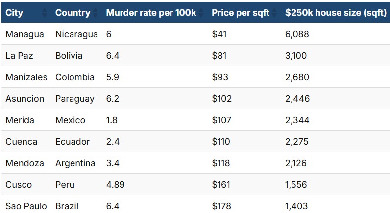 La Paz, Bolivia, rounds out the top three for property size, offering 3,100 square feet at $81 per square foot. At 6.4 per 100,000, La Paz matches the murder rate of São Paulo while providing more than twice the property size.