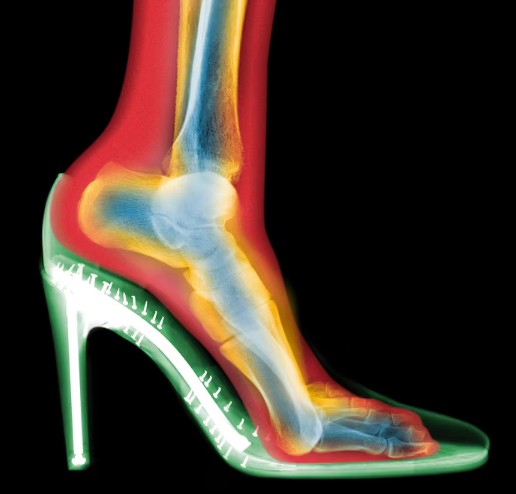 Colored MRI-style X-ray shows a stiletto shoe elevating the heel and forcing the foot into a downward angle. This altered position shifts body weight forward, changing gait mechanics and increasing strain on the knees, hips, and lower back. (Photo By Nick Veasey, Science Photo Library)